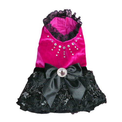 Ultra glamorous velvet party dress with rhinestone necklace, ribbon bow, and crystal buckle. Lace skirt with raised rose motifs and lined with tulle. Velcro closures. 50% cotton, 50% polyester. Pink.
